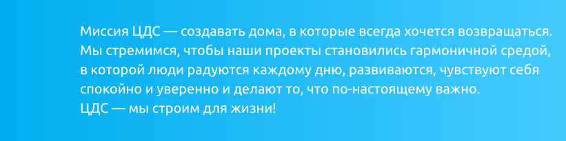 Группа ЦДС — это компания решений для жизни. Мы проектируем, строим, продаем и обслуживаем доступное жилье и окружающую инфраструктуру в соответствии с собственными высокими стандартами качества. На протяжении более 20 лет нашу работу направляет простое, но очень важное стремление — делать качественное решение квартирного вопроса доступным здесь и сейчас.